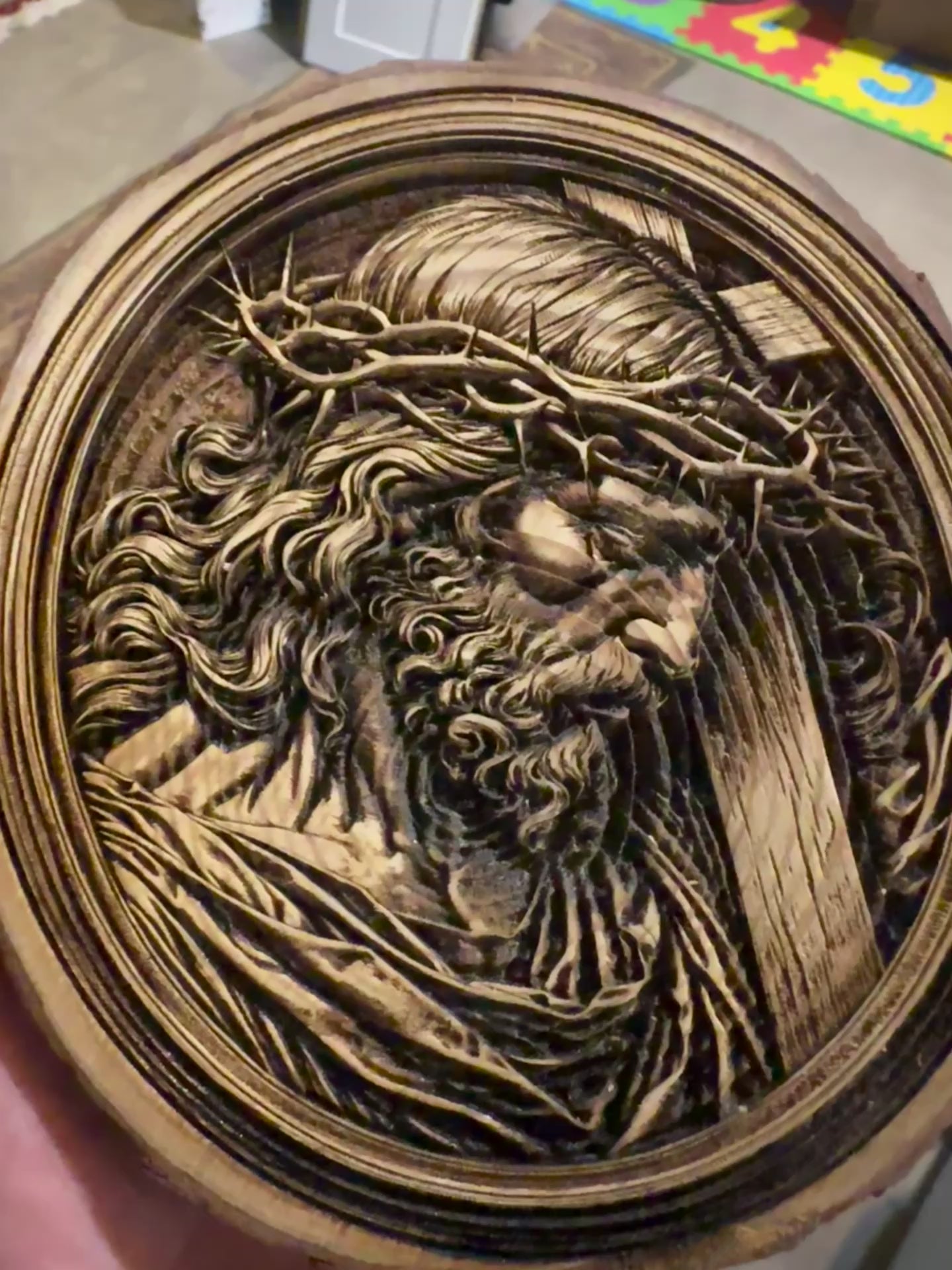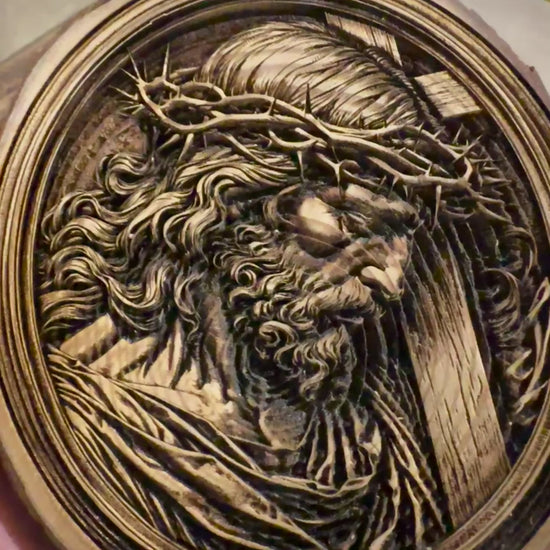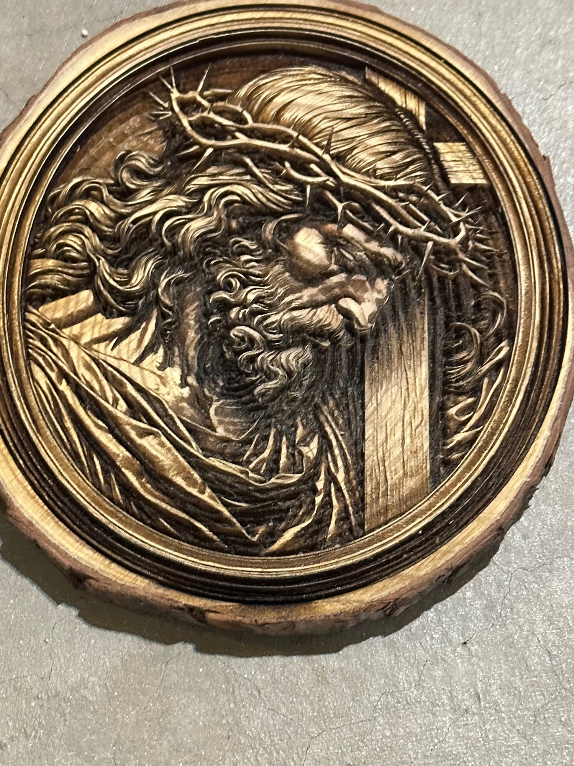 3D laser engraved Jesus carrying cross on live edge wood round measuring approximately 5-5.5 in diameter. No 2 pieces will be the same due to variations in wood grains. Wood is not sealed.