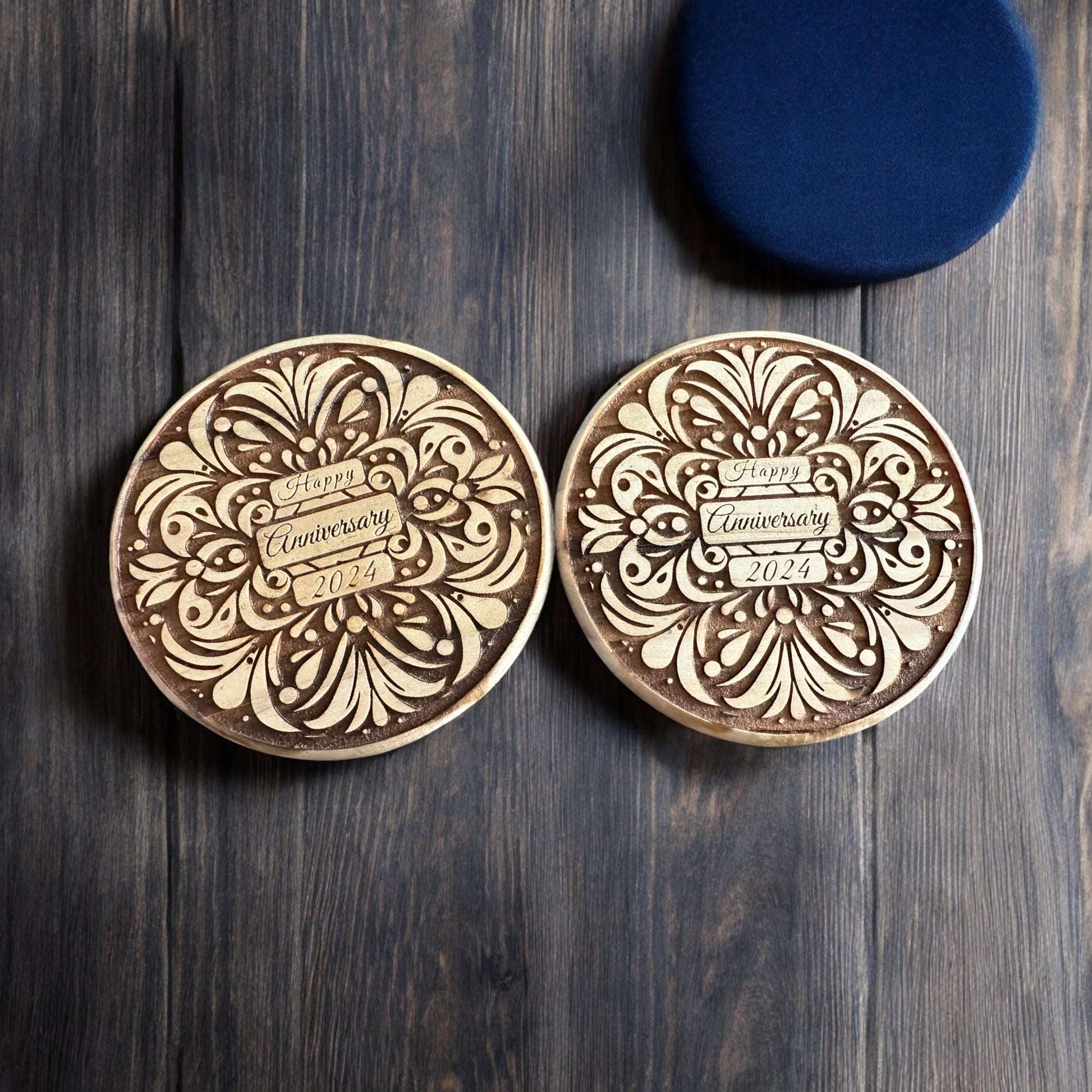 4 in round wood coasters. Sealed with poly matte acrylic sealer for water resistance. Treat with bar or bamboo oil to keep them from cracking. Wash with warm soapy water.